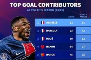 体育资讯7月11日讯 德国转会市场列出了本赛季巴黎队内参与进球榜,登贝莱52场参与51球居首,巴尔科拉参与42球次席。