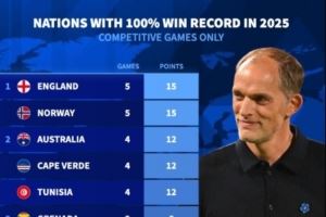 体育资讯9月11日讯 根据德转统计,今年有11支代表队正式比赛全胜,英格兰队、挪威队5战全胜,澳大利亚队、佛得角队、突尼斯队4战全胜。