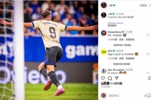 莱万社媒晒出自己庆祝进球的照片,配文:三分到手