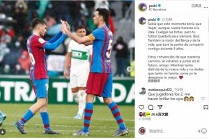 体育资讯9月27日讯 布斯克茨宣布本赛季结束后退役,巴萨中场佩德里社媒发文,为他送上祝福。
