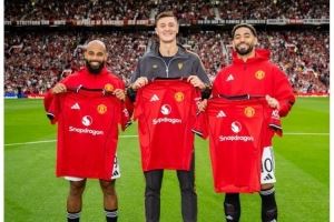 体育资讯8月9日讯 曼联官方更新社媒动态,晒出新援库尼亚、姆贝莫、塞斯科手拿曼联球衣的合照。